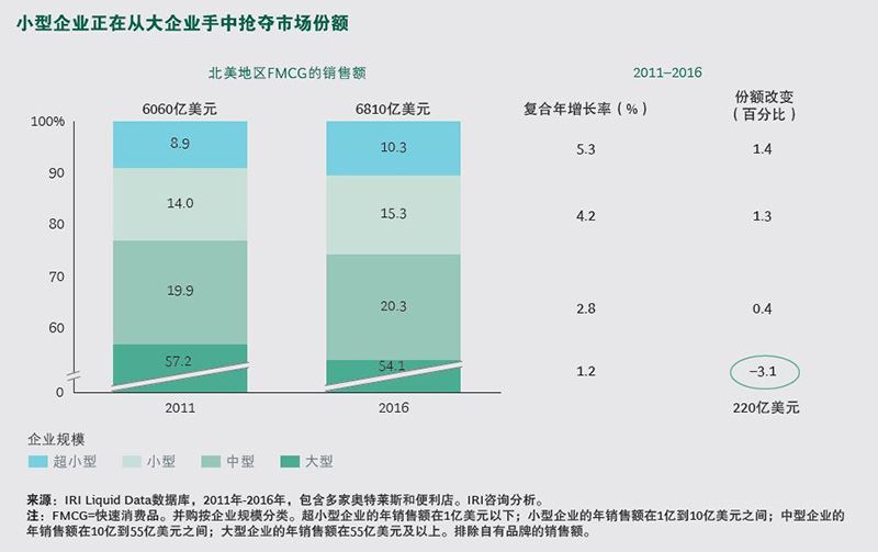過去50年,跨國消費(fèi)品企業(yè)強(qiáng)化品牌、擴(kuò)展產(chǎn)品組合、穩(wěn)步提高市場(chǎng)占有率和收入,創(chuàng)造了強(qiáng)大的股東價(jià)值。那曾是大媒體、大零售商、大品牌的時(shí)代。大約五年前,規(guī)模較小的企業(yè)和品牌首次開始瓜分大品牌的蛋糕。在2011年到2016年間,北美地區(qū)大約220億美元的行業(yè)銷售從大企業(yè)轉(zhuǎn)移到小企業(yè)。歐洲也經(jīng)歷了同樣的改變。